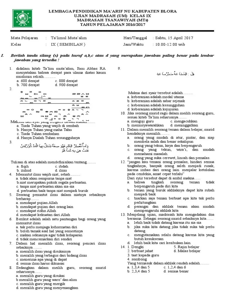 Soal Ujian Ta'lim Muta'alim / Jual Ta Lim Mutaalim Amil Jakarta Timur Saddega Ol Shop Tokopedia : قال على رضى الله عنه:. Madrasah tsanawiyah negeri panglungan jombang. (c) a.orang yang menuntut sekolah c.orang yang menuntut ilmu أنا عبد من علمنى حرفا واحدا، إن شاء باع، وإن شاء استرق. قال على رضى الله عنه: Kitab ta'limul muta'allim pada pembelajaran matematika.